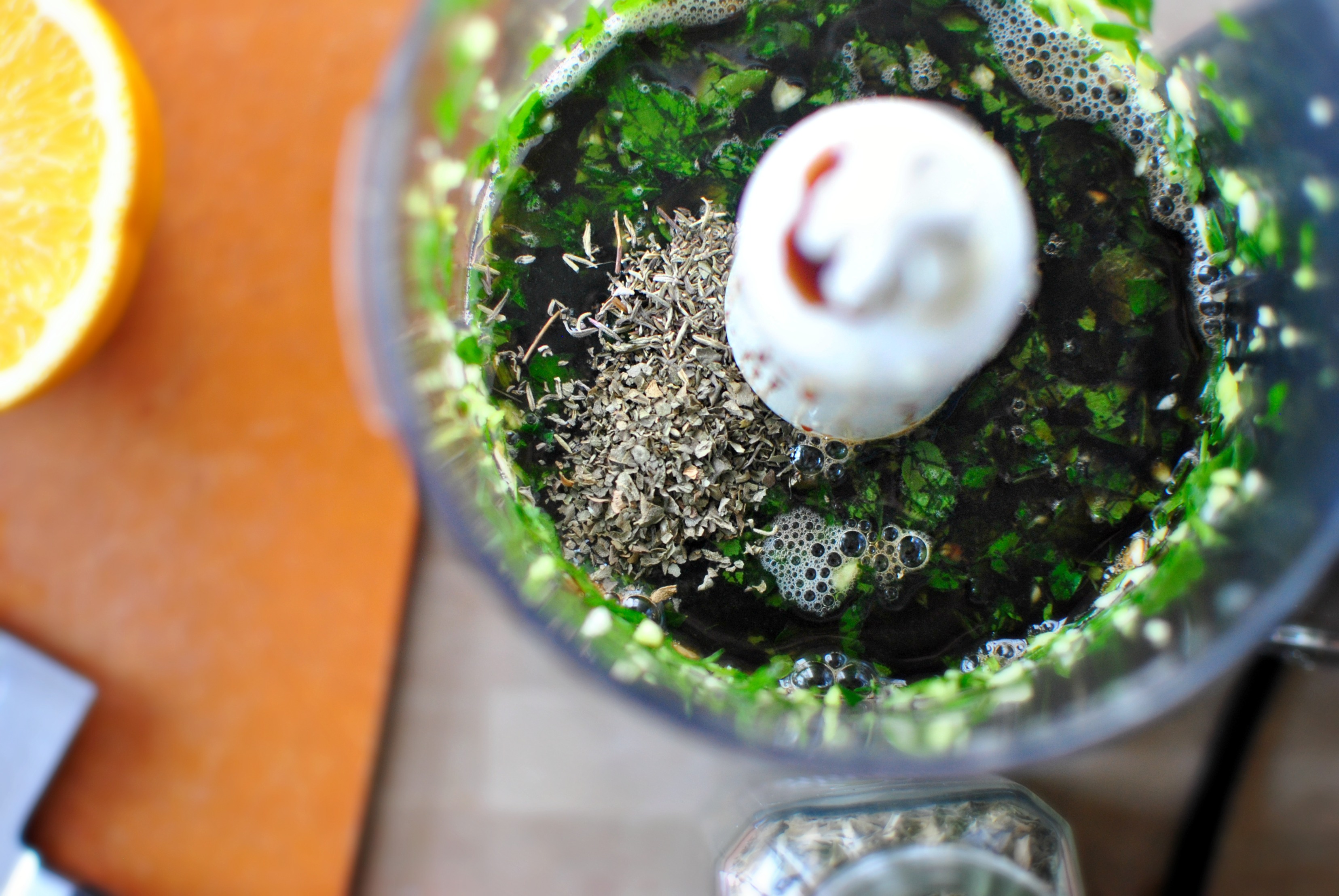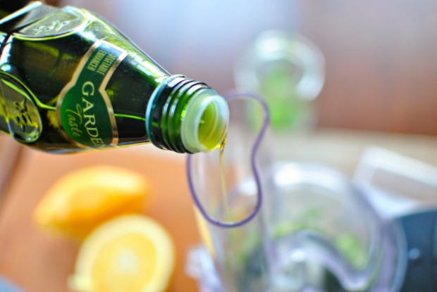 Secure the lid and turn the processor on. Next, slowly drizzle in the extra virgin olive oil.