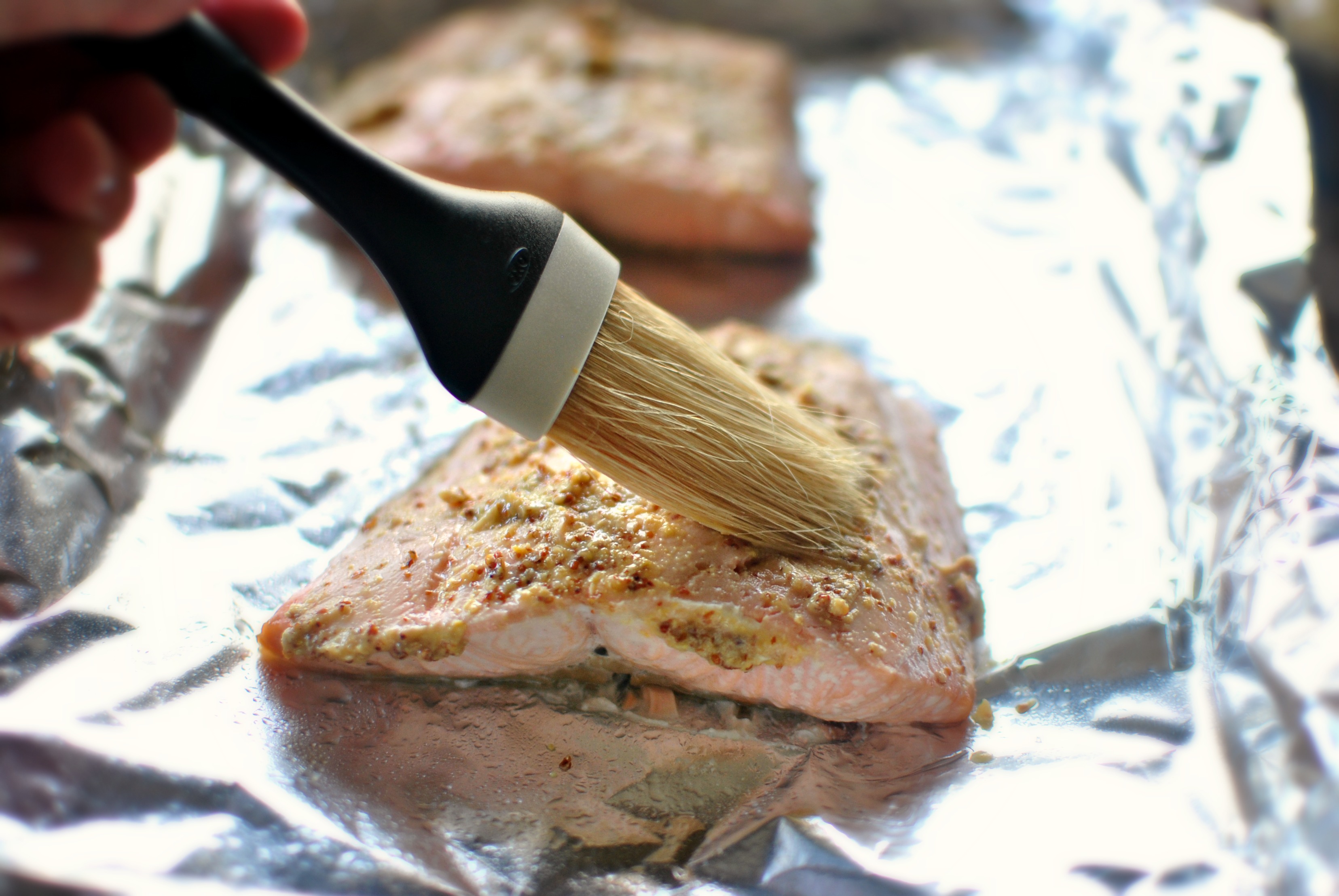 - Flip the salmon over and top each with a heaping teaspoon of grainy Dijon Mustard. Spread the mustard evenly before sprinkling each with a heaping tablespoon of dark brown sugar. Return the salmon to the oven and continue to broil for 5-6 more minutes. Let the salmon cool while slightly while you prepare the salad.