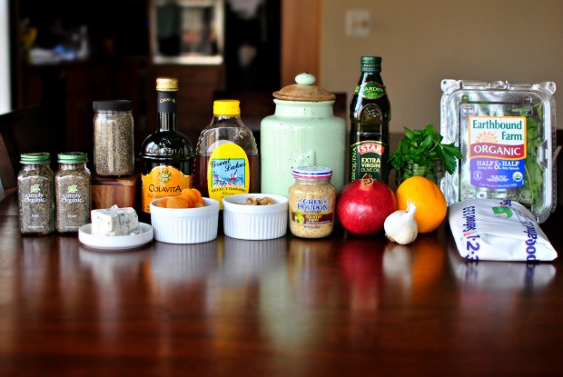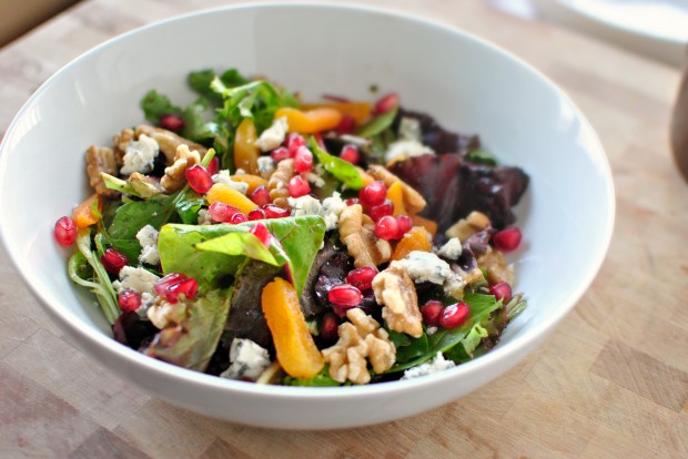 - Toss 5 ounces of your favorite salad greens into a bowl and drizzle a few tablespoons of the vinaigrette over top. Toss to coat. Divide the salad among two large, shallow bowls and top with the sliced, dried apricots, toasted walnuts, bleu cheese and pomegranate arils.