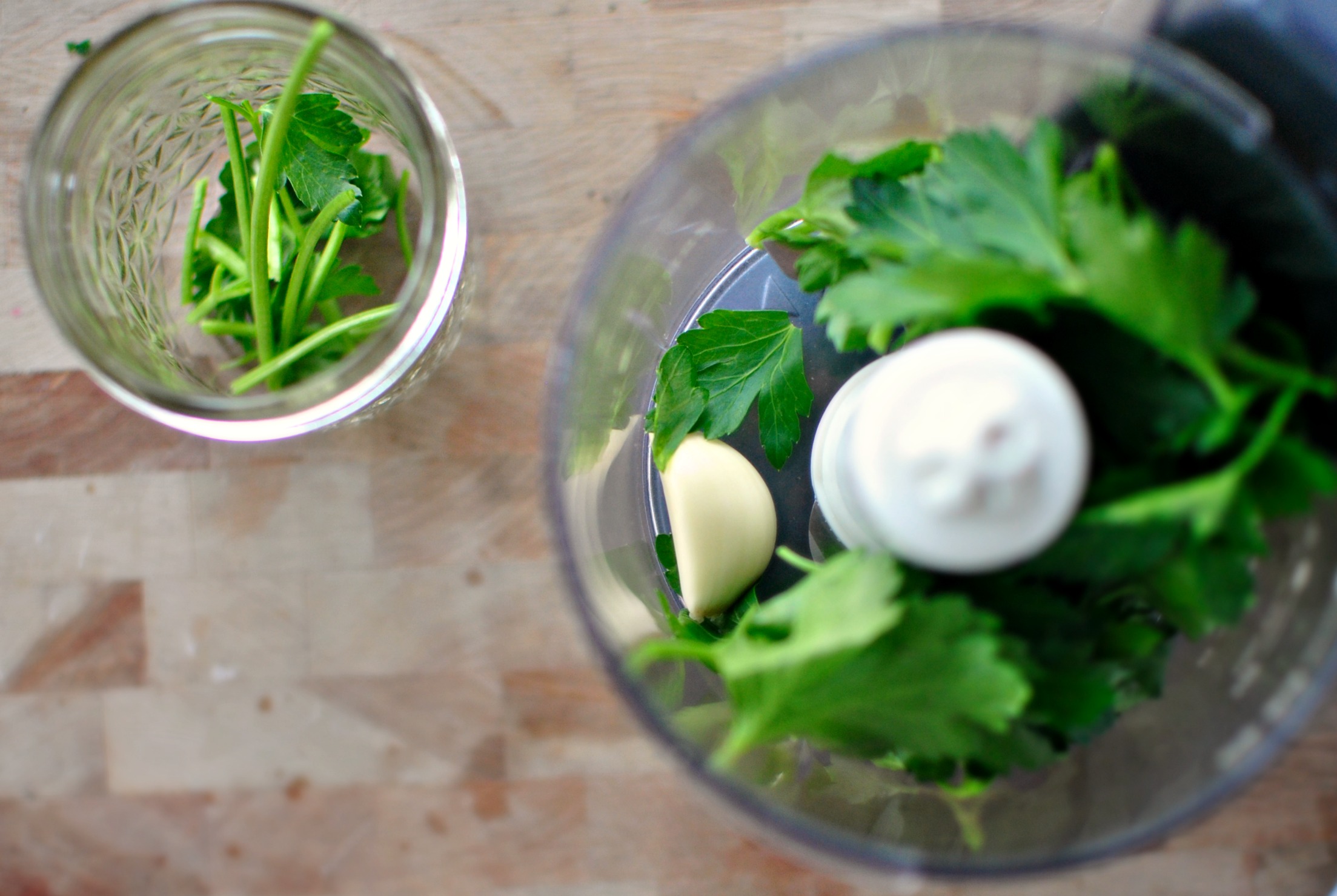 Throw a big-o clove of garlic into a mini food processor {or blender} along with a handful of fresh parsley.