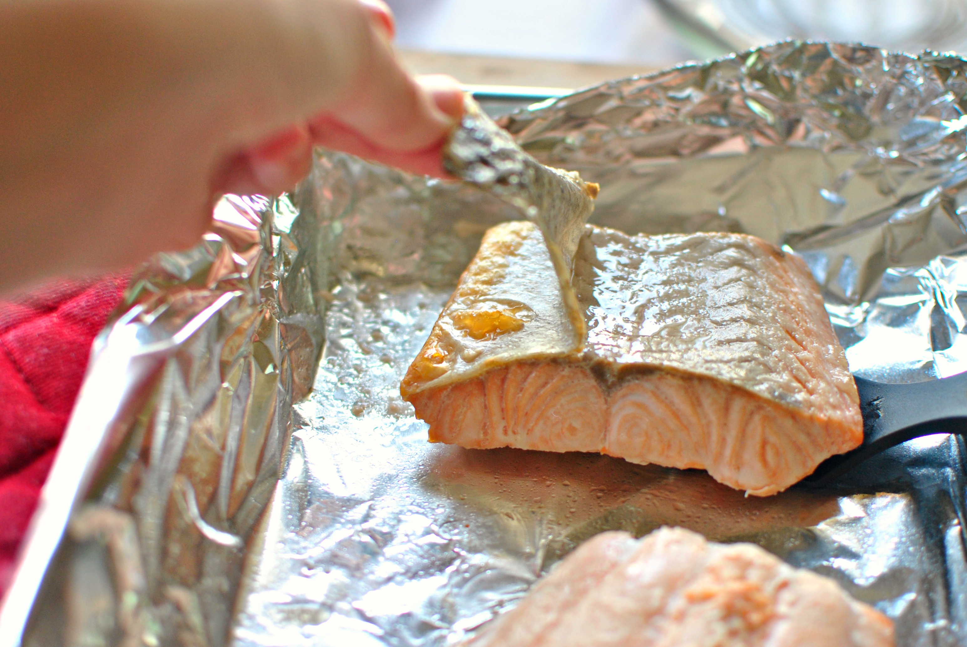 Then after the first 6-7 minutes are up, remove the salmon from the oven and carefully {so you don’t burn those precious fingies} remove the skin by peeling it off. It’s really that simple.