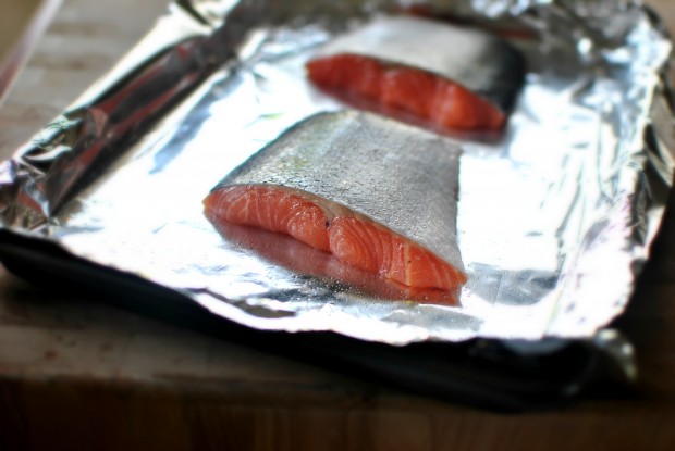 I usually purchase salmon with the skin on. You totally don’t have to. But if you do and you’re wonder how in the heck you are going to remove it. Well this is how; first line a baking sheet with foil and then lightly mist with olive oil. Next, lay the salmon down, skin-side-up and broil for 6-7 minutes.