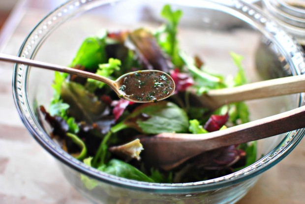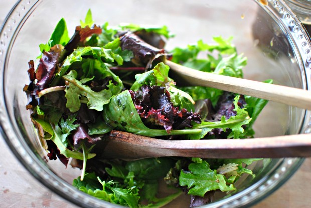 Next, toss 5 ounces of your favorite salad greens a few spoonfuls of the citrusy vinaigrette over top.