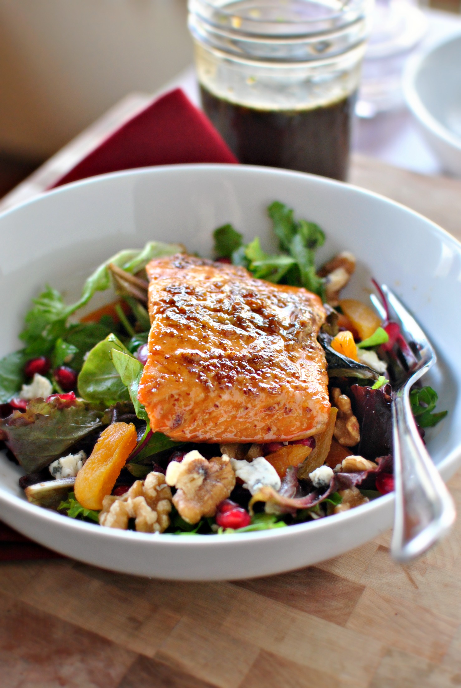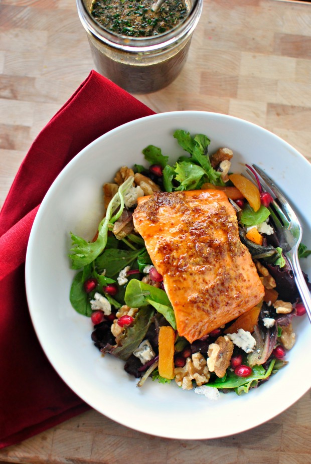 So. With that said, this salad is all kinds of amazeballs. From the sweet and tangy salmon to the bright pop from the pomegranate arils, the toasted walnuts and let’s not forget the bleu cheese. I kid you not, I could eat this salad for days.