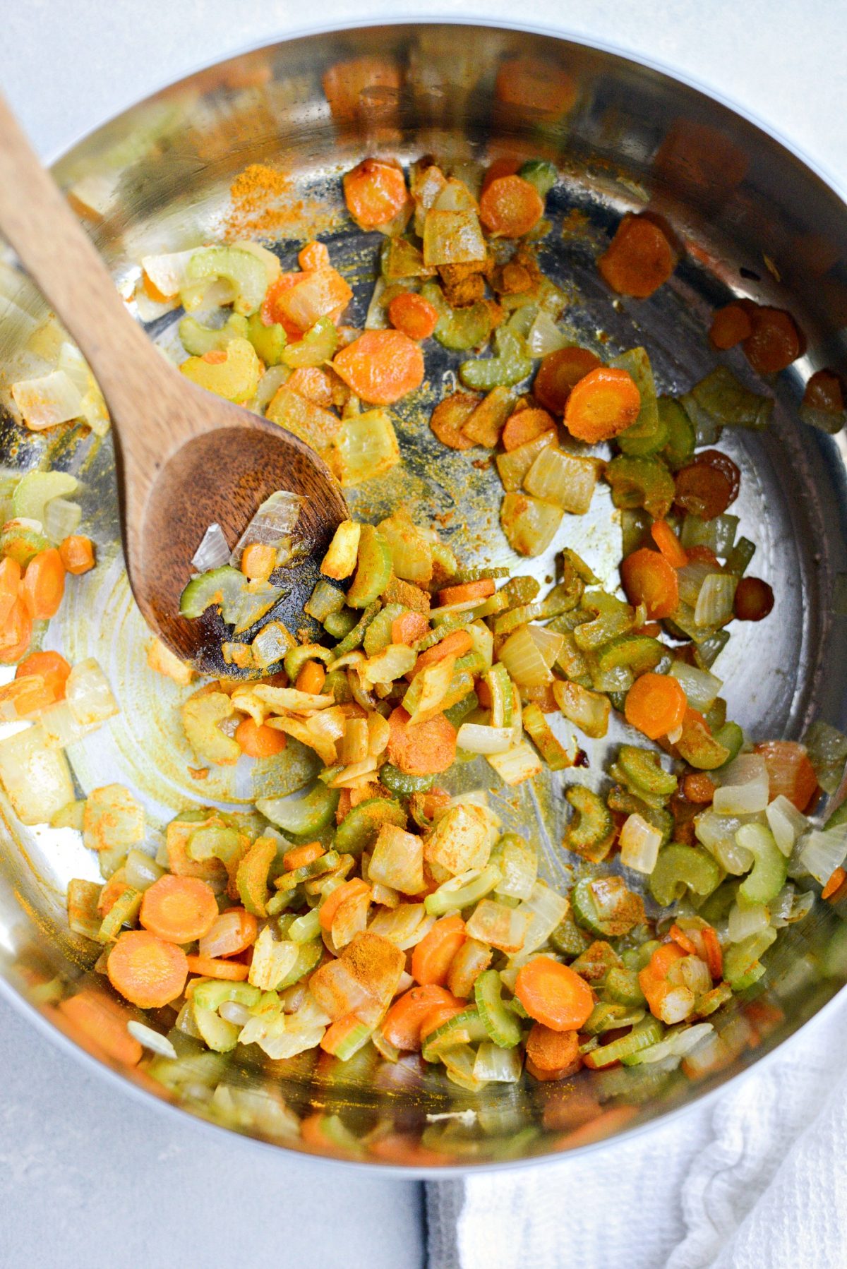 Start by sautéing 1 sliced carrot (or 2 medium size) and 1 to 2 (sliced) stalks of celery along with 1/2 cup diced yellow onion in 1 tablespoon of olive oil. Season with a pinch of kosher salt. Cover and cook, stirring occasionally until soft and tender, about 8 to 10 minutes.
