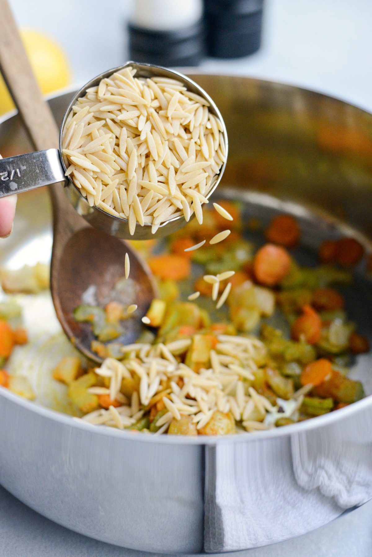 - Stir in the turmeric before adding in the orzo, broth and water. Bring to a simmer and cook the pasta until al dente or about 10 to 15 minutes. Stir occasionally to keep the pasta from sticking to the bottom of the pot.