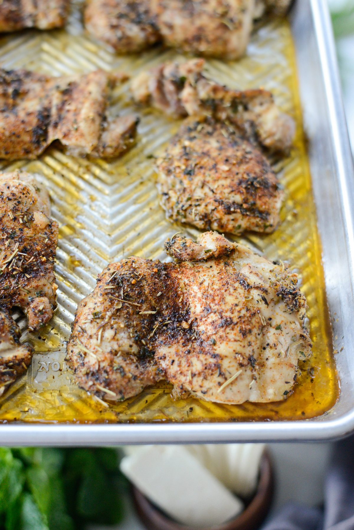 First, place 1-1/4 to 1-1/2 pounds of chicken thighs (or breasts) onto a rimmed metal baking sheet. Then drizzle with 2 tablespoons olive oil, the juice of 1/2 a lemon, 2 tablespoons of homemade Greek seasoning and a pinch of kosher salt. Lastly, toss to combine before roasting in your preheated 400° degrees for 25 minutes or until fully cooked and smelling crazy delicious.
