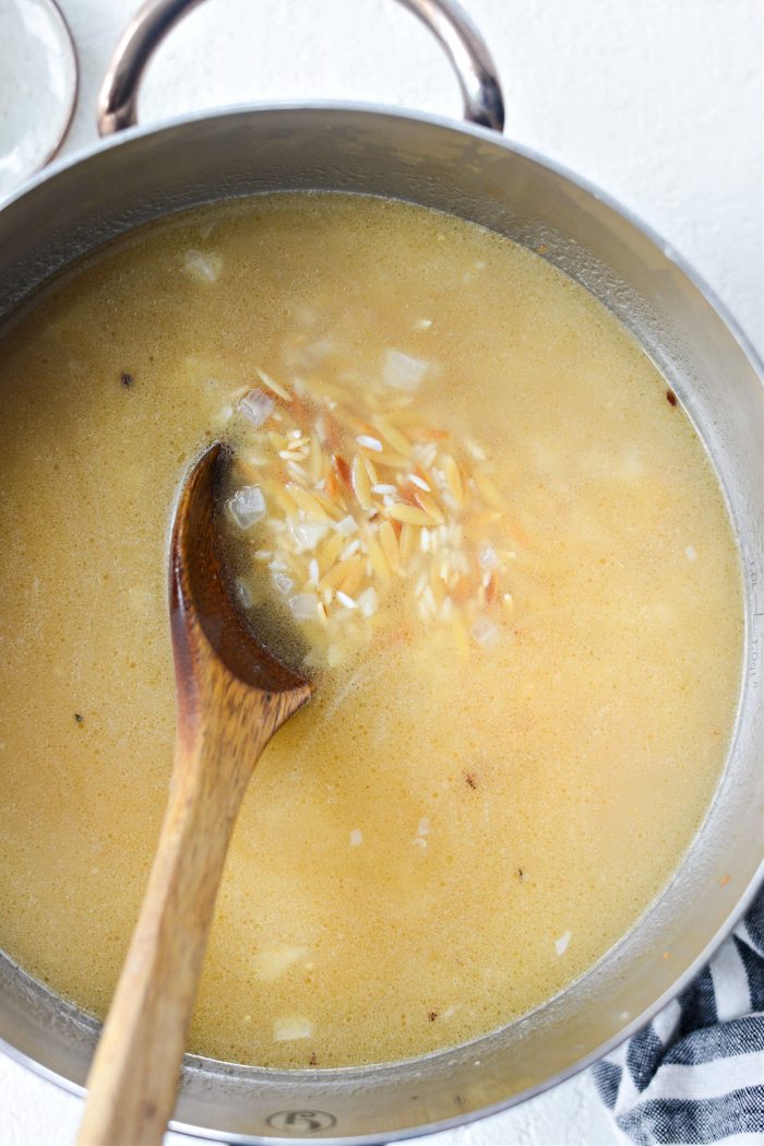 Butter makes everything better. And that is precisely why I first toast orzo pasta and rice in butter. Not only does the pasta gets all golden and absolutely gorgeous, but it also gives this pilaf a nutty, browned butter flavor. This in contrast with the freshness of lemon is incredible. So whatever you do… don’t skip this step!