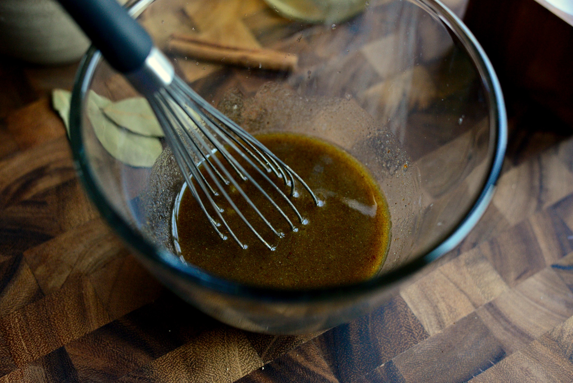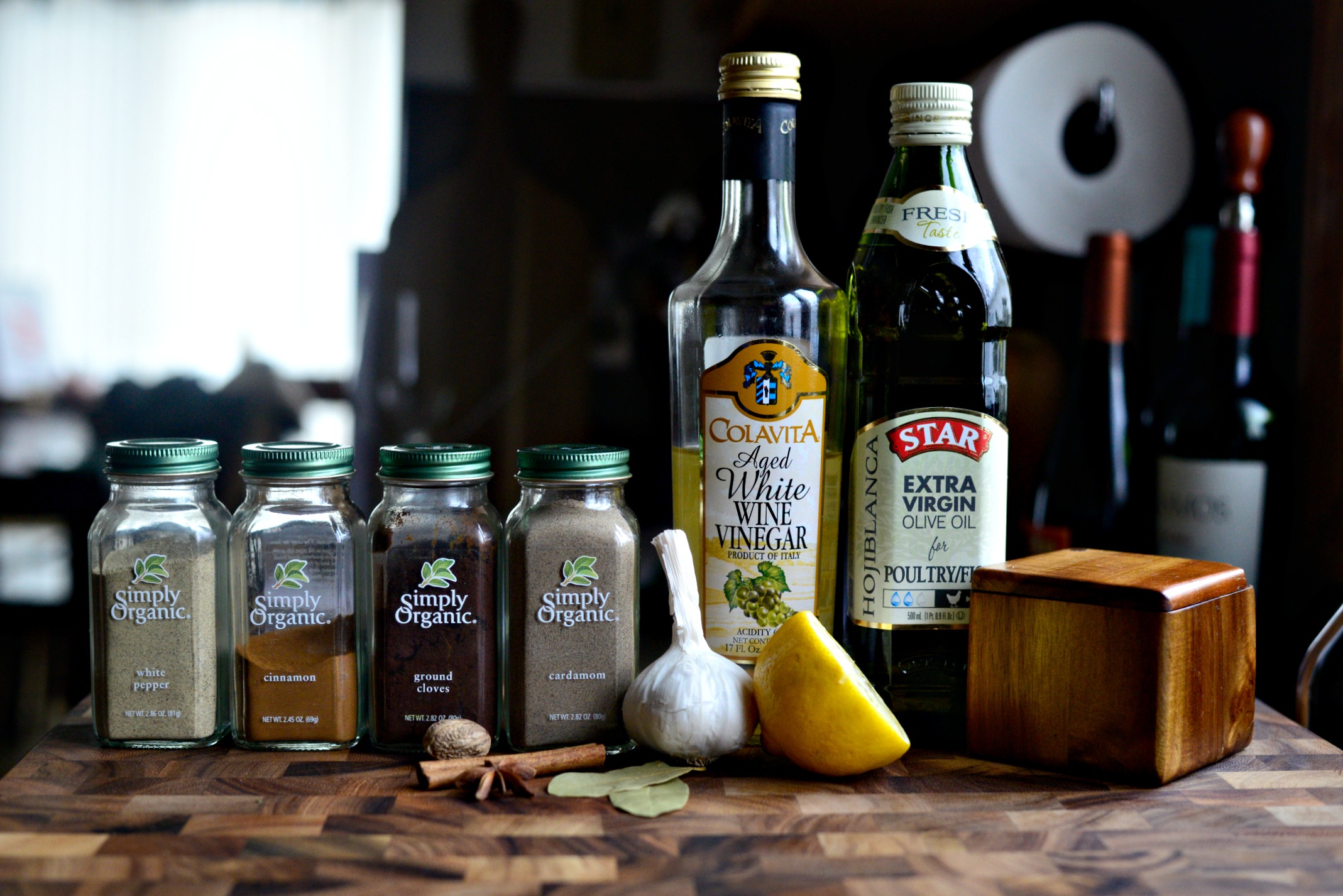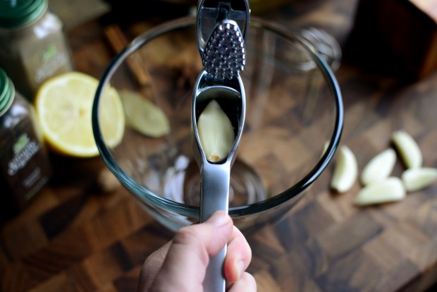 - In a small bowl combine the garlic, salt, cardamom, white pepper, cinnamon, nutmeg and clove. Add the lemon juice, olive oil and vinegar. Whisk to combine and set off to the side.