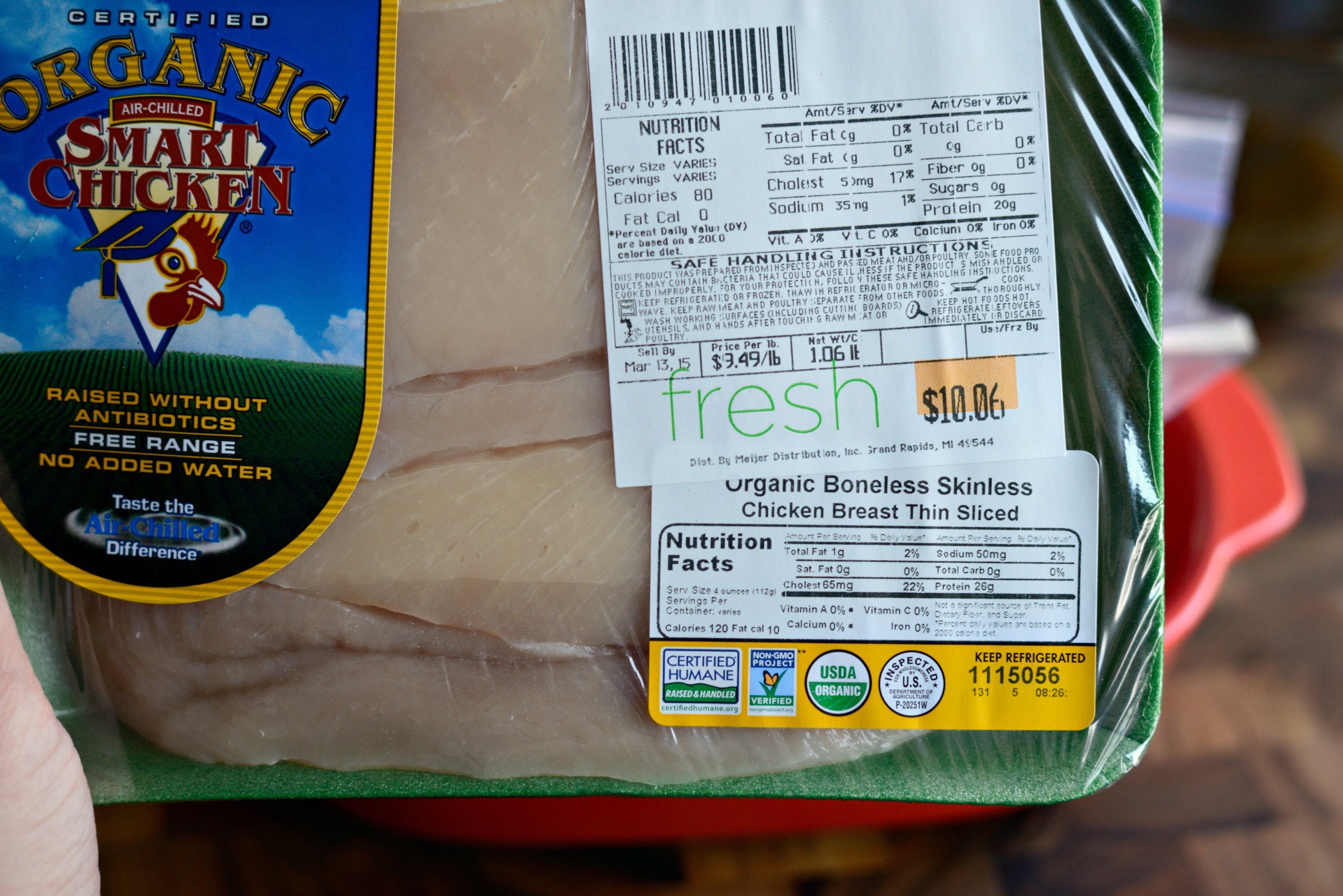 Next grab 2 pound boneless, skinless, thin-sliced chicken breasts. If you can’t find thin cup or halved chicken breasts, you may want to butterfly regular chicken breasts to get thinner pieces.