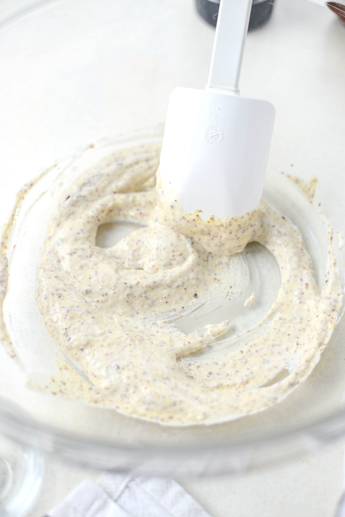 Meanwhile, in a large bowl combine 1/4 cup of mayonnaise, 2 tablespoons country-style mustard, 1 teaspoon onion powder, 1/2 teaspoon aleppo pepper (I had it on hand from making this recipe, but you can swap it with 1/4 teaspoon red pepper flakes) and grate in a large clove of fresh garlic.