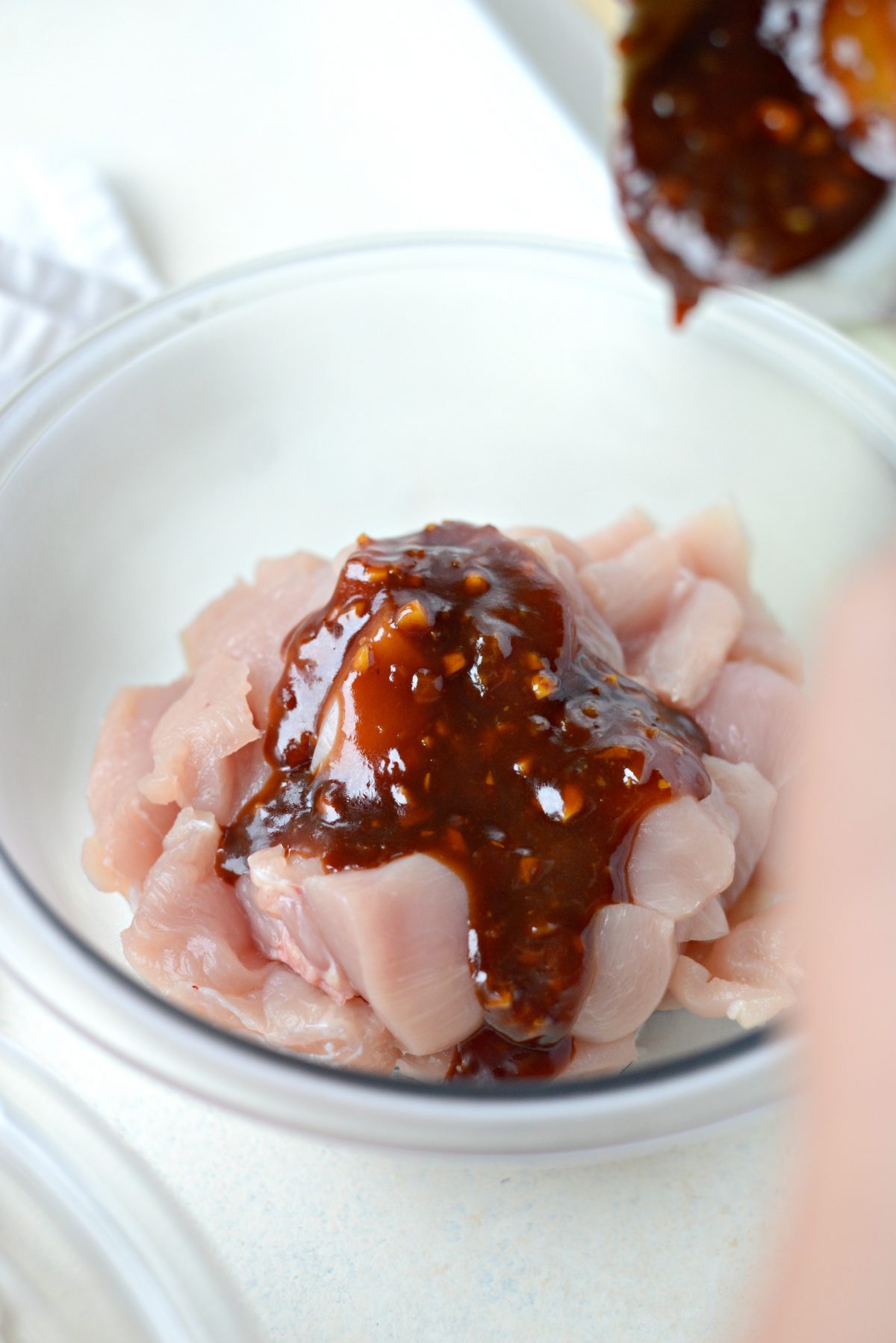 - Once the sauce has cooled, pour 1/2 to 3/4 cup over the chicken and toss to coat. Reserve 1/2 cup for brushing and the remaining sauce can be served on the side.