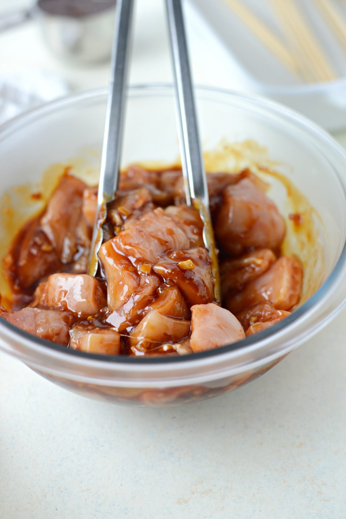 Reserve 1/2 cup for brushing on the chicken when on the grill. The remaining sauce can be saved and then served with the grilled chicken skewers.