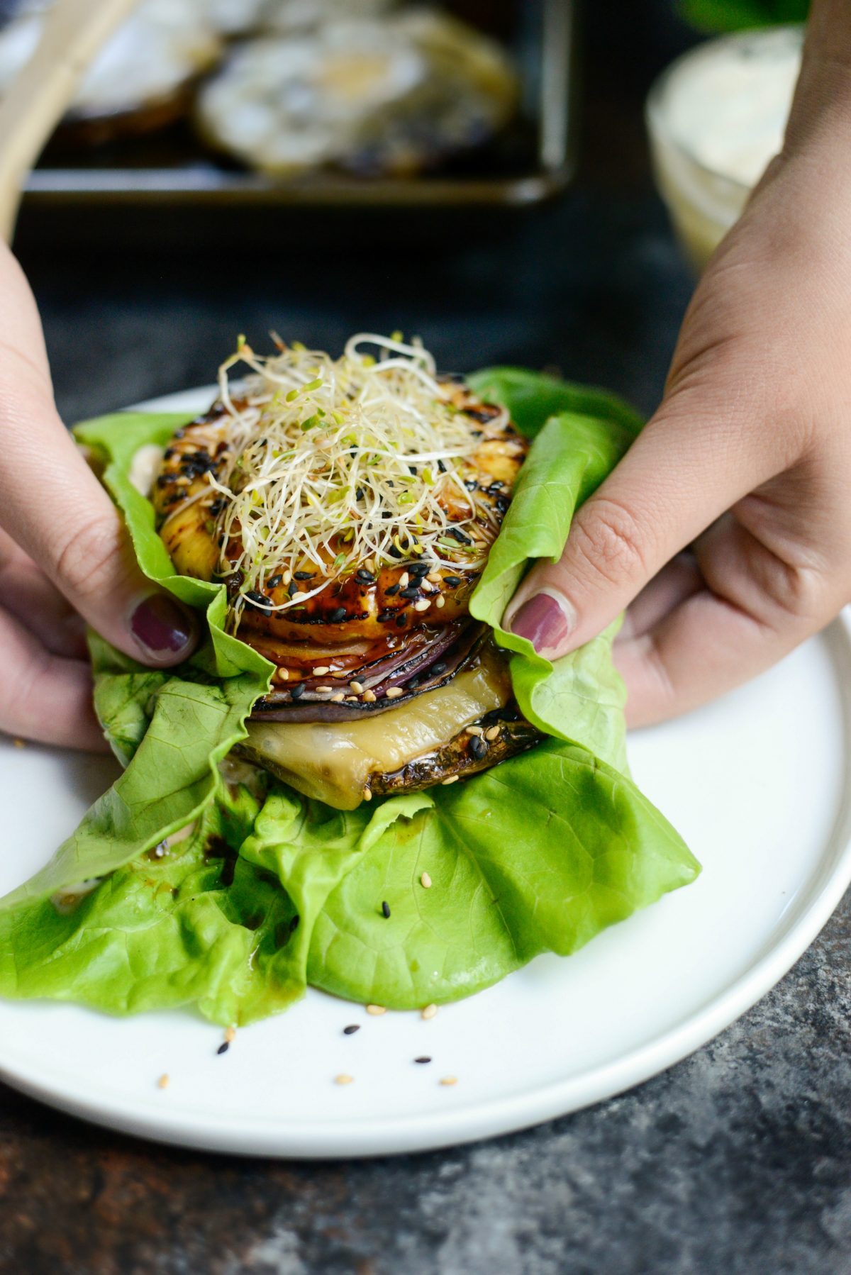 Thick, meaty mushrooms are slathered in homemade teriyaki sauce and grilled until tender and caramelized. Then I top each burger with a slice of gouda, and once it melts into cheesy bliss, I nestled the burger into butter lettuce leaves and topped it with lots of grilled red onion, a slice of grilled pineapple and fresh sprouts. I even went a step further and made a honey wasabi mayo to tie this delicious burger together.