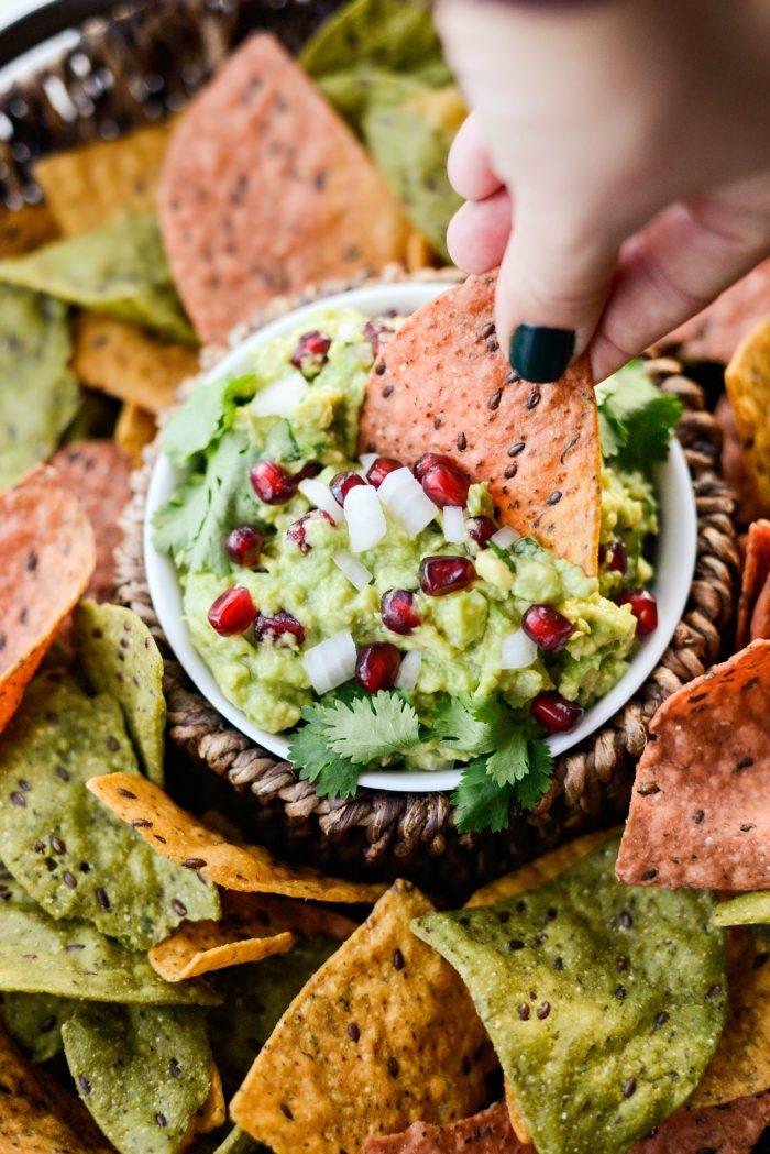 This year, I’m throwing some ruby red pomegranate arils in it, serving it with festive chips and calling it Holiday Guacamole, because I can and because it’s pretty and equally delicious.