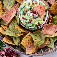 Pomegranate seeds add a pop of color and tartness to this Holiday Guacamole. Make this addictively delicious and festive dip and watch it disappear in minutes! This recipe makes a lot so you have plenty to serve at your get together, and trust me, this will go fast.