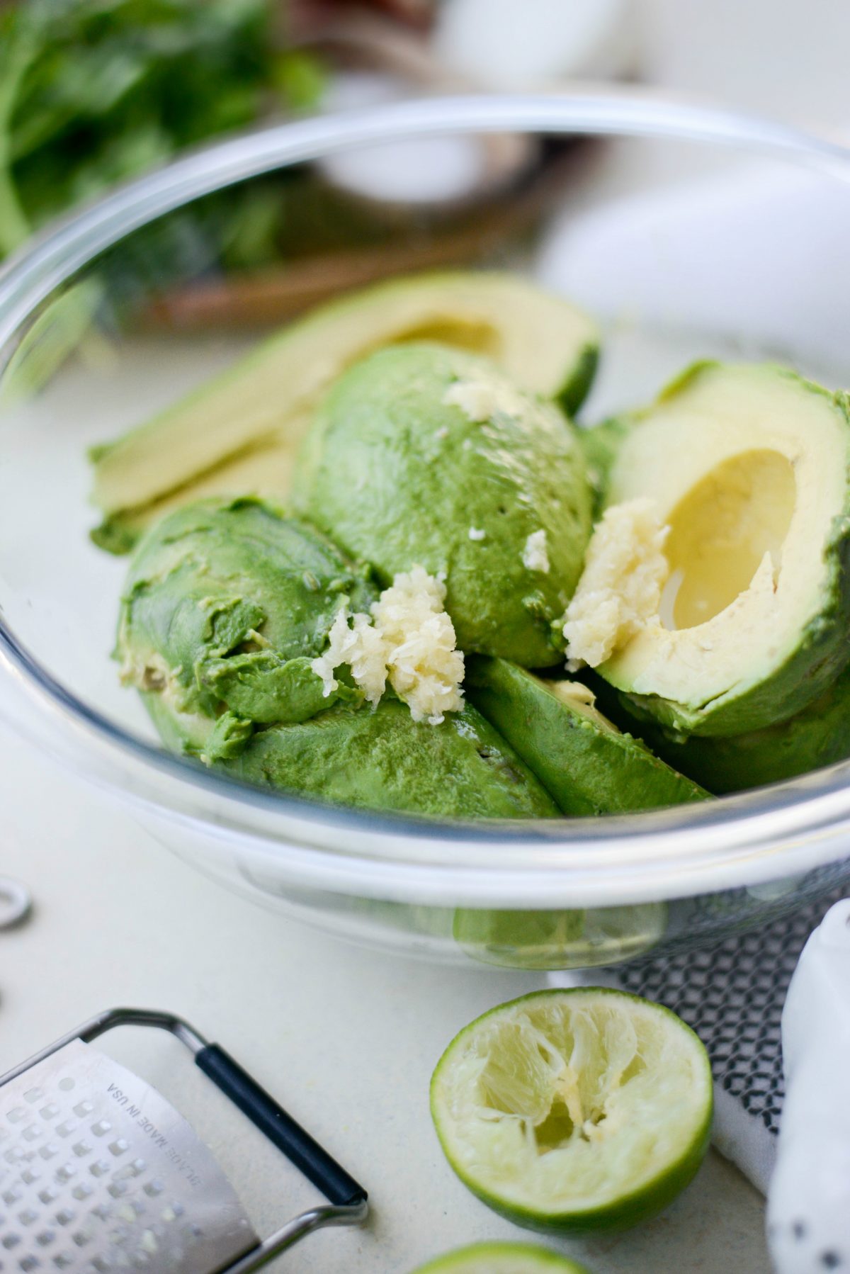 - Add the lime juice and garlic, and use a potato masher to smash the ingredients together until it reaches your preferred texture.