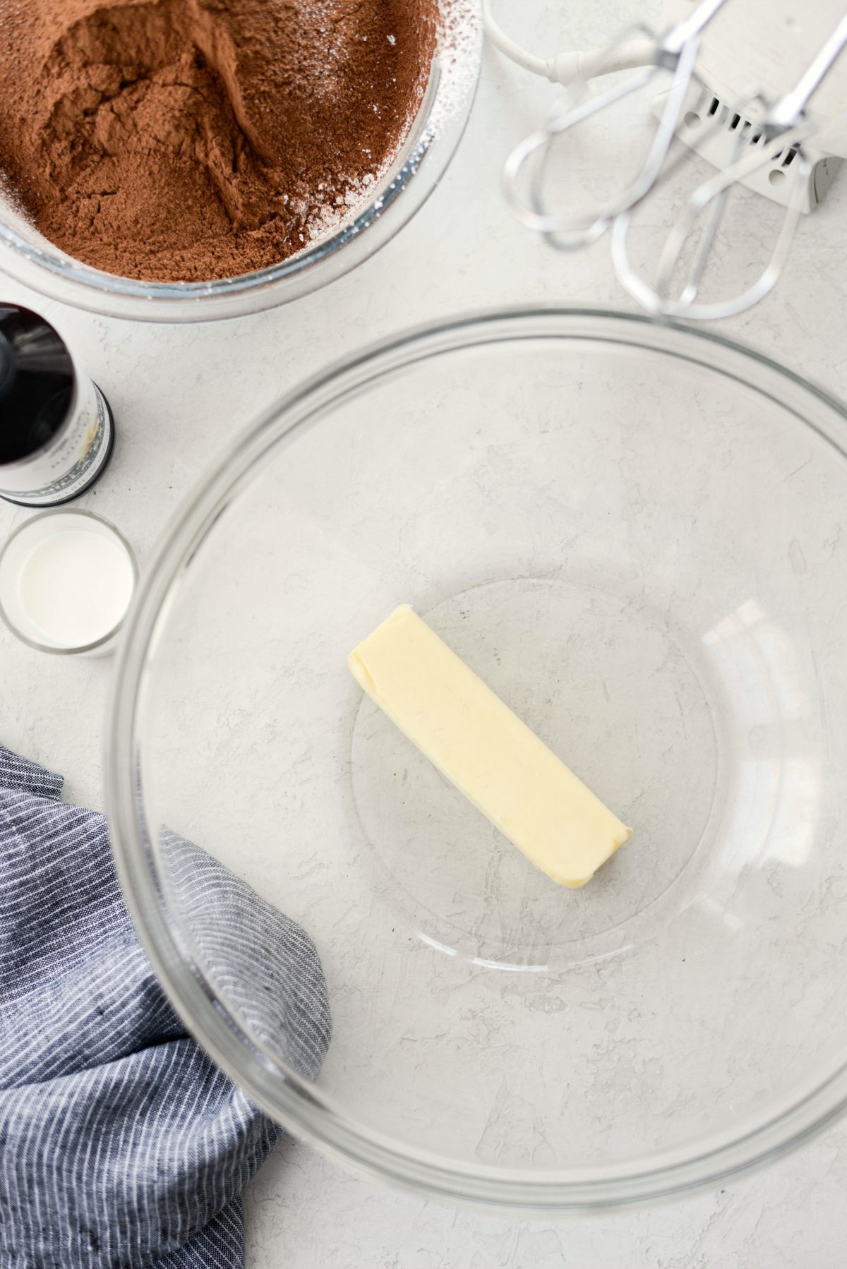 Add 1 stick unsalted butter to a mixing bowl or bowl of your stand mixer.