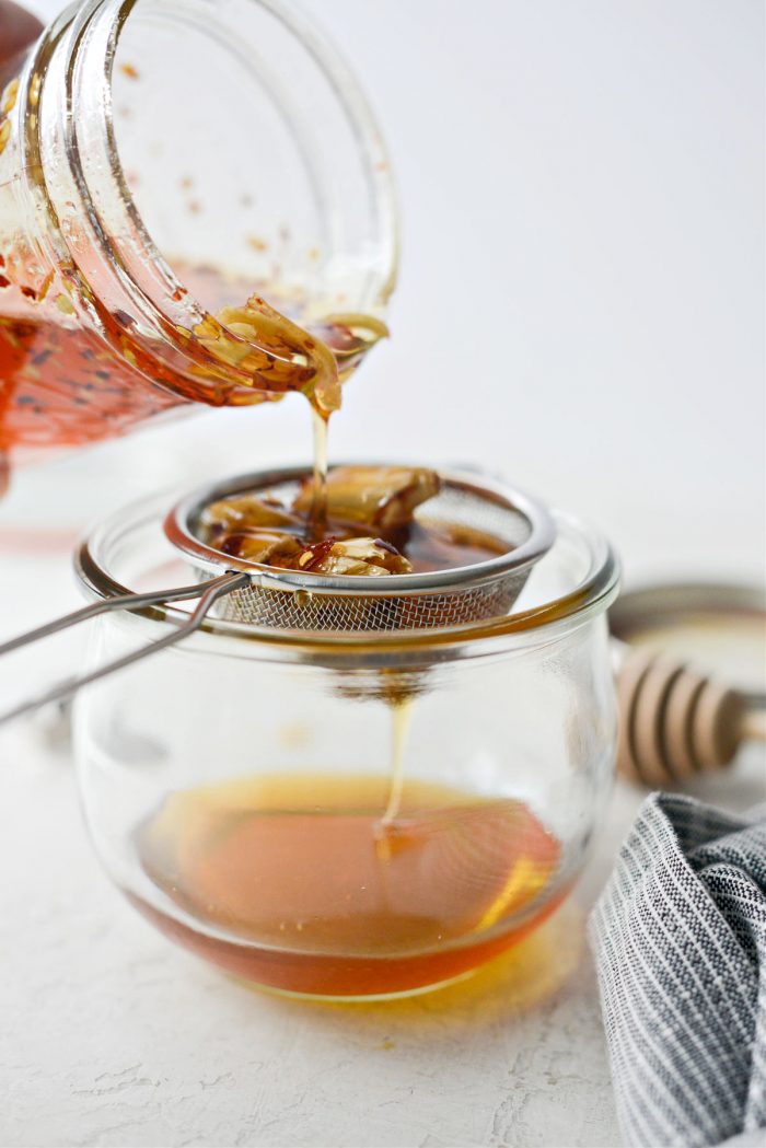 - Once infused, remove the garlic and chili flakes by pouring the honey through a strainer into a clean jar.