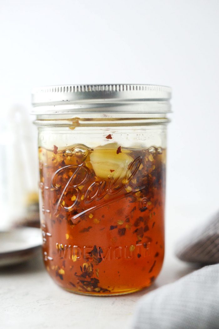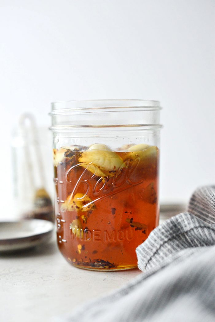 This homemade Garlic Hot Honey is simple and flavorful. Garlicky with slight back of the throat heat meets sweet honey. Drizzle it over brie cheese, pizza, cooked shrimp or roasted sweet potatoes. Yields 2 cups.