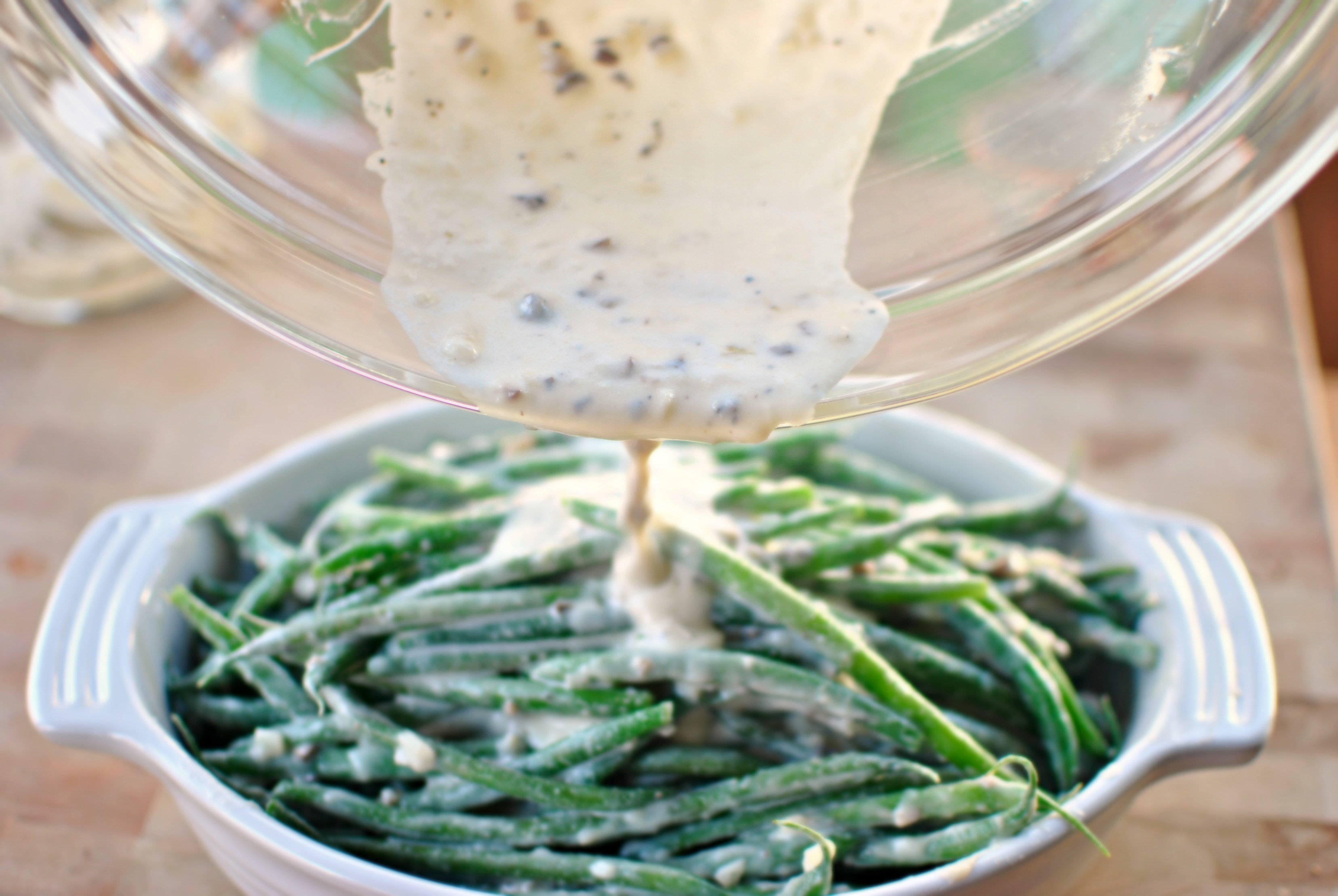 - Lastly add in the cut blanched green beans and toss into the creamy sauce. Transfer the casserole mixture to the prepared dish and spread evenly. Cover the dish with aluminum foil and bake on the middle rack of your preheated oven for 20 minutes. Meanwhile make the fried shallots.
