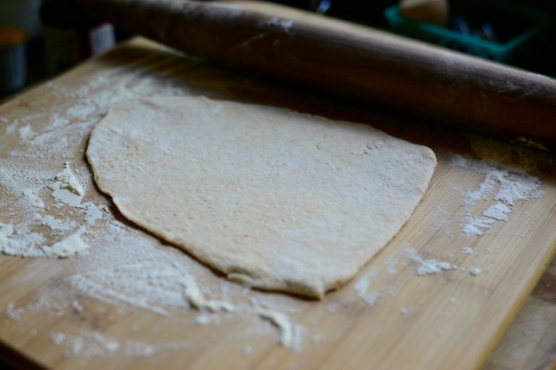 Use a floured rolling pin to roll the dough out thin, about 1/8 of an inch think. I repeat this with the remaining pieces of dough and layer them between a clean dish towel.