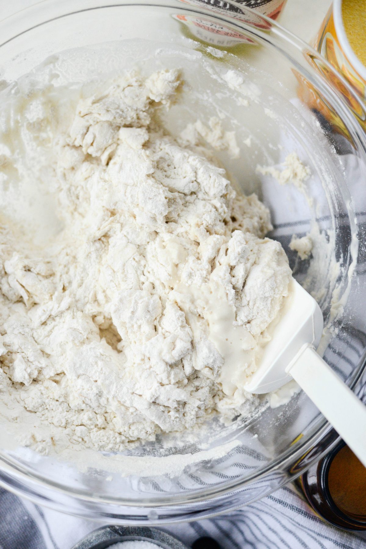 Then switch to a rubber spatula and mix the flour mixture in with the water, until all of the flour is incorporated and the dough is super sticky.