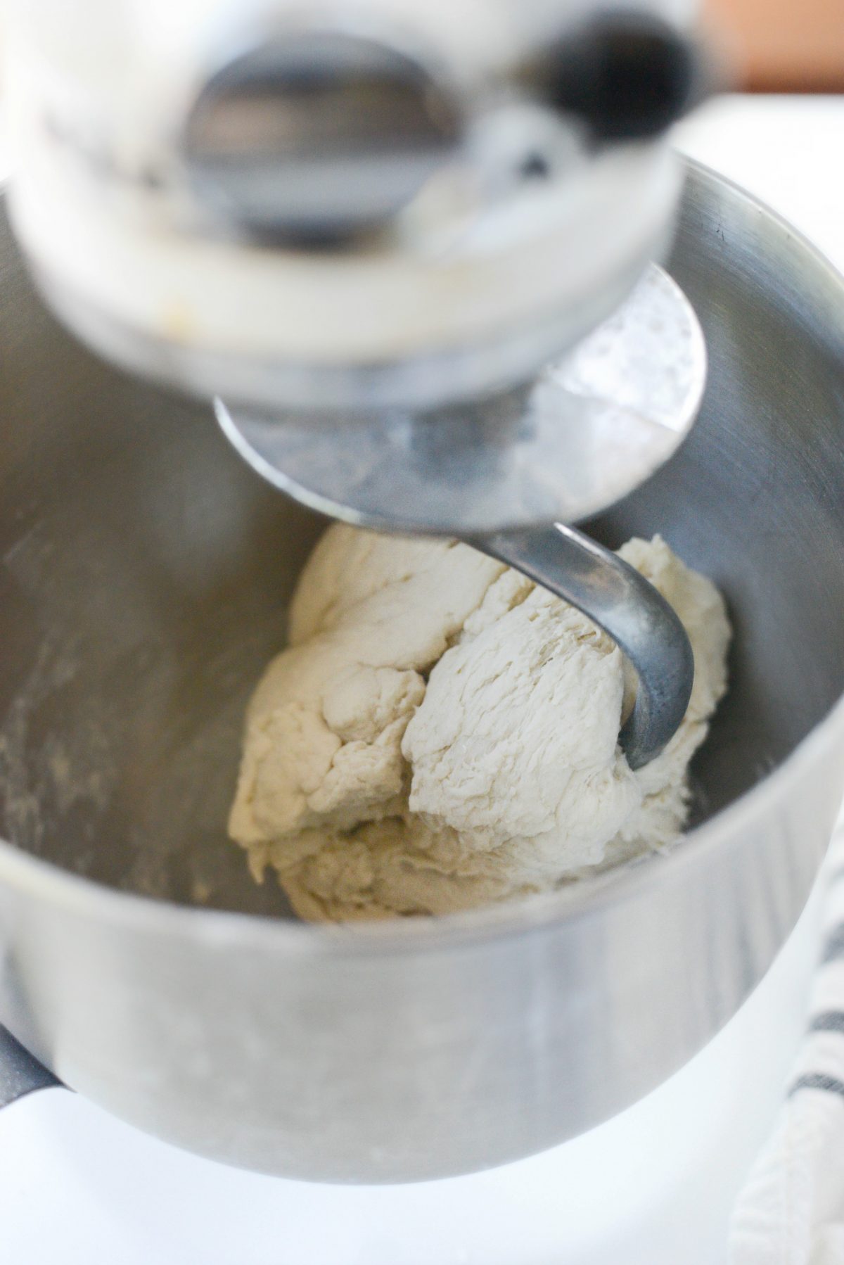 Then scrape off the dough from the paddle attachment and switch over to the dough hook. Mix on low speed until a smooth dough forms, this should take around 6 minutes or so.