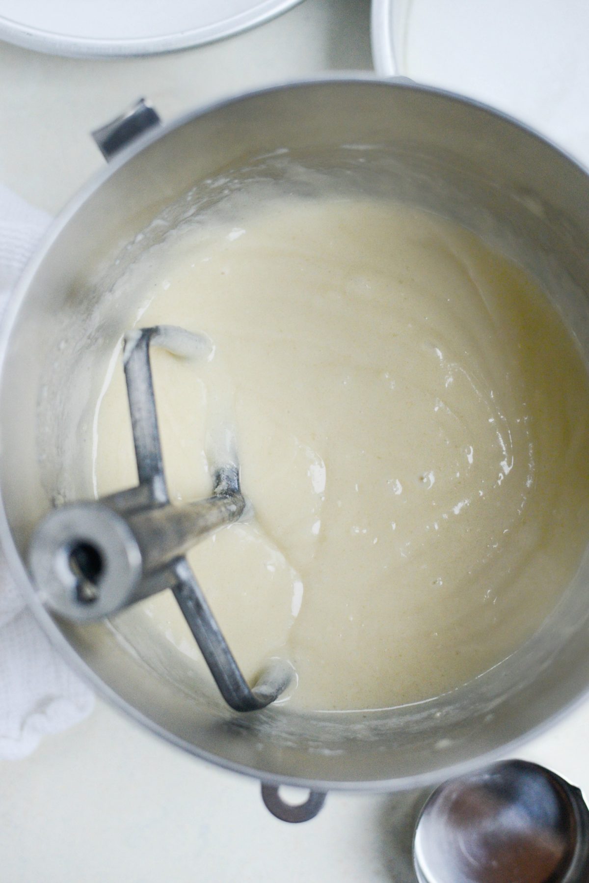 First pour all of the homemade white cake mix into the bowl of you stand mixer. Secure the paddle attachment and you’re good to go.