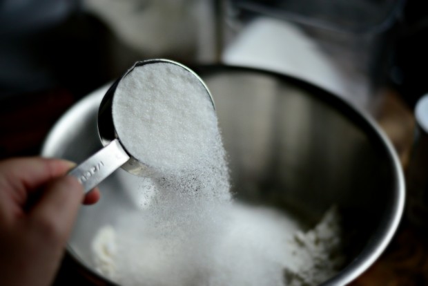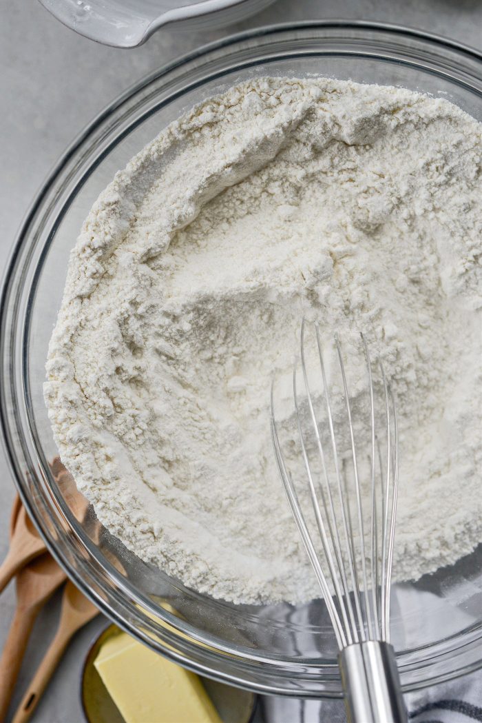 - In a large bowl whisk together the flour, sugar, baking powder and salt. Add in the butter and use a pastry blender to blend the butter into the dry ingredients.
