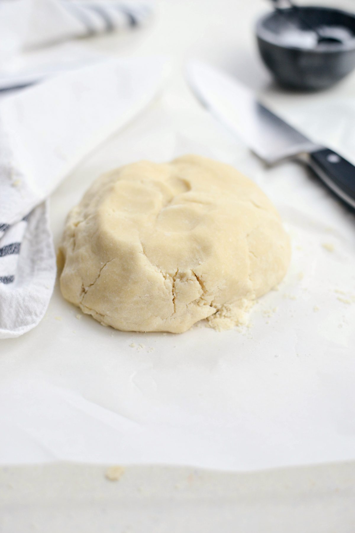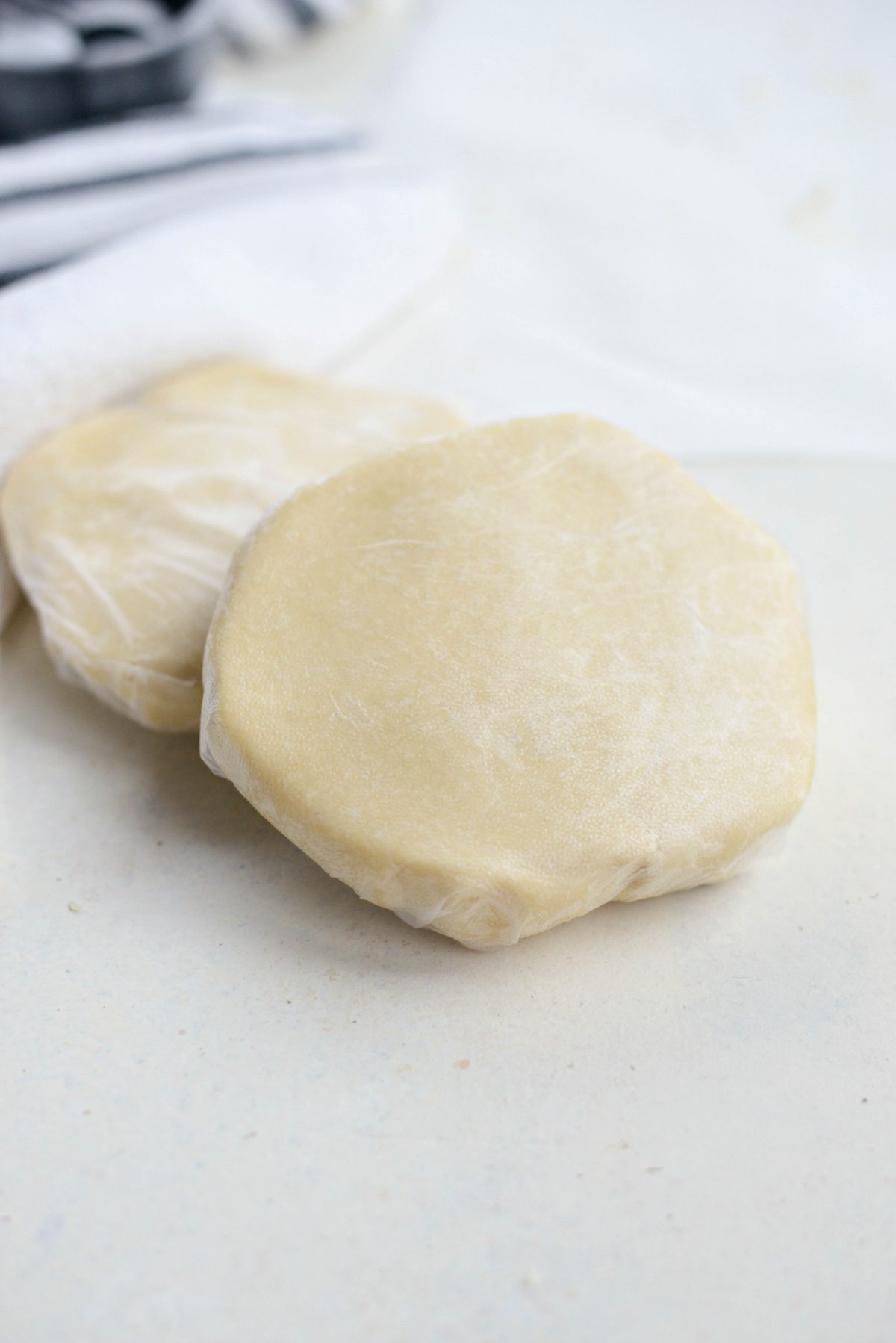 - On a clean surface or in a bowl, form the pie dough into a disc and divide in half (about 10 ounces each). Form both pieces of dough into 2 round disks and wrap tightly into plastic wrap.