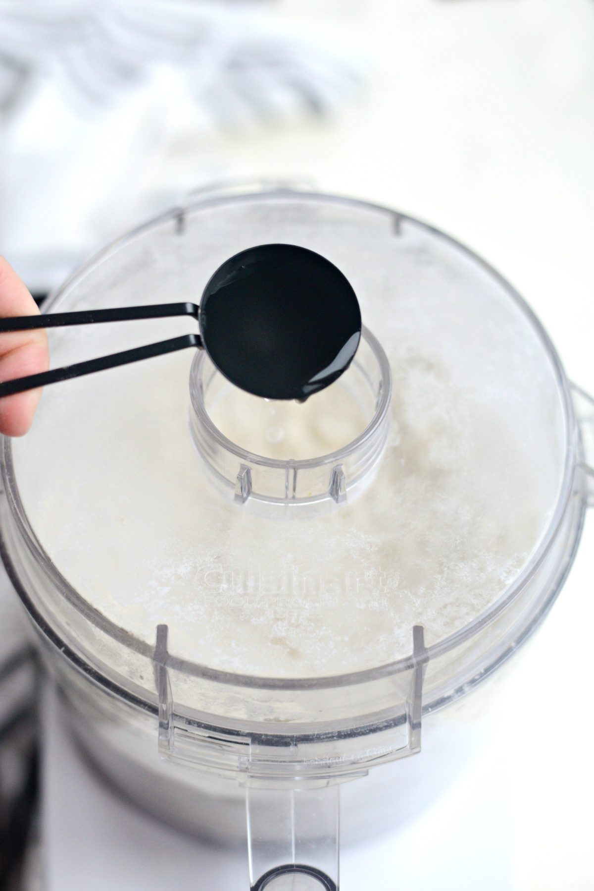 - Next add one tablespoon at a time (3 to 4 tablespoons usually works best for me), pulsing after each addition until it forms in to large clumps and resembles coarse slightly wet sand.