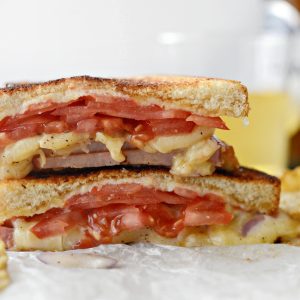 An Irish Toasted Special calls for simple ingredients yet is incredibly delicious! In my version of this classic pub sandwich; fried ham, thinly sliced tomatoes, red onion and melty Irish cheddar is stacked between skillet-toasted bread. Yields 1 sandwich but can easily be doubled to serve more.