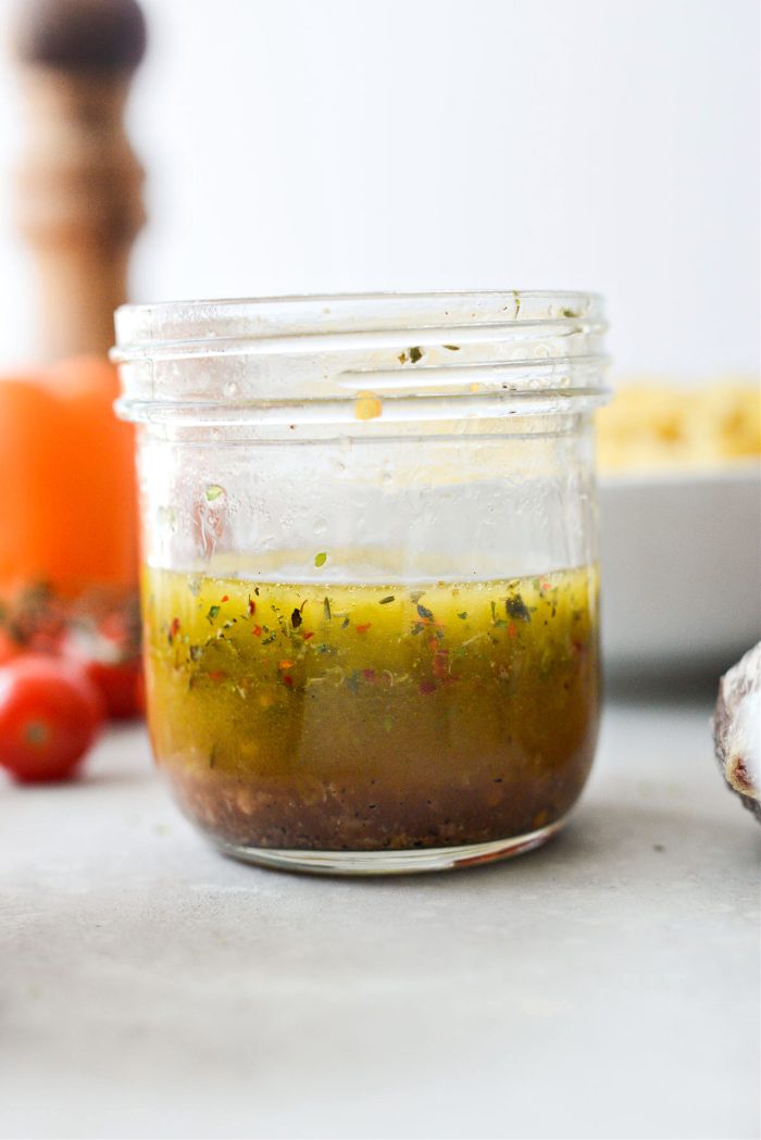 In a glass jar or container (with a tight-fitting lid), grate in a clove of garlic and add in 1 teaspoon of Italian seasoning, 1/2 teaspoon of red pepper flakes, 1/2 teaspoon kosher salt and 1/4 teaspoon freshly ground black pepper. Next, pour in 1/4 cup of red wine vinegar and 6 tablespoons of good quality olive oil.