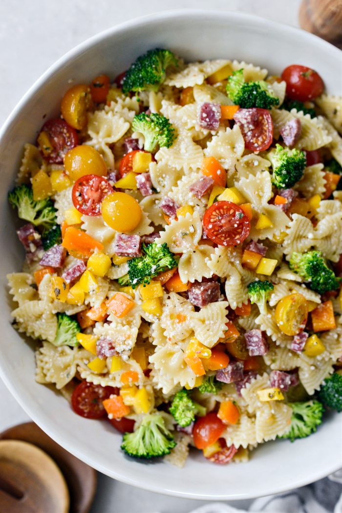 In this Italian Bowtie Pasta Salad, colorful veggies are tossed with cooked bowtie pasta, Genoa salami, Parmesan cheese and a super simple Italian dressing for the ultimate summer pasta salad! Quick and easy to whip up and incredibly fresh and delicious! This recipe yields 12 (1-cup) servings.