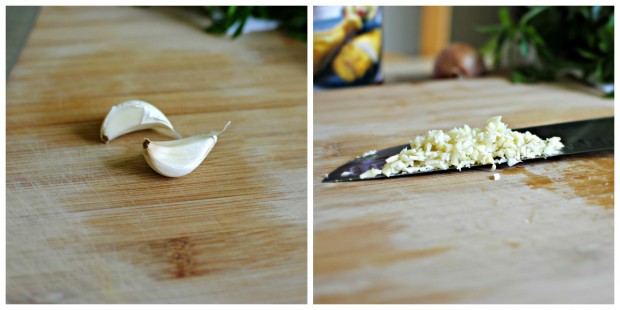 Start off by smashing, peeling and mincing up two gloves of garlic.