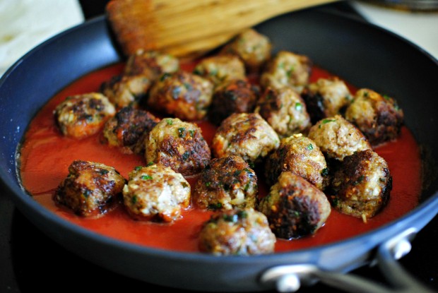 I think the mixture of lean ground turkey and ground chuck is stellar for meatballs. The fat from the ground chuck is just enough to make these moist (ugh. I hate that word) and the texture perfect!