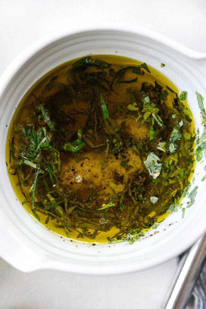 Start by grabbing a bowl, jar or whatever you’ve got; and add 1 tablespoon of thinly sliced basil, 1 teaspoon chopped fresh oregano and 1/2 teaspoon chopped fresh thyme, grate in a medium clove of garlic (about 3/4 of a teaspoon), 1-1/2 tablespoons of sugar (or honey) to sweeten the dressing a smidge. Then pour in 1/4 cup of champagne vinegar.