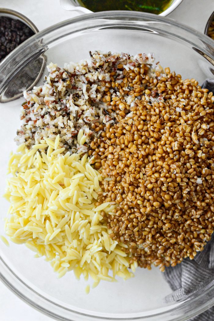 - In a large bowl, combine the cooked wild rice, wheat berries, orzo, peppers, corn, onion, almonds, currants and parsley. Toss to combine.