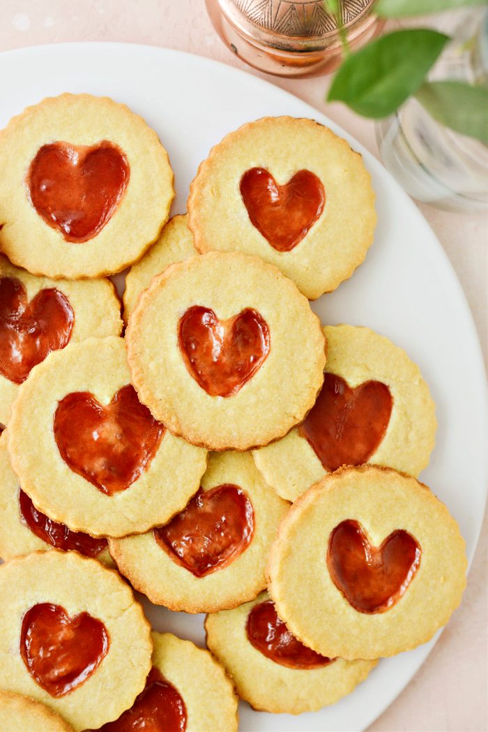 These simple cookies start with a one-bowl butter cookie dough. With ingredients like butter, sugar, egg yolks, vanilla and almond extract and flour – it’s likely you have all of this on hand already! This dough comes together rather quickly and can be rolled out and baked without needing to chill in the fridge first – which I love. To make the hearts I use the rounded end of a teaspoon and then use my impeccably clean hands to smooth and press the insides of the hearts flat. This part is more tedious yet enjoyable at the same time. Lastly, pipe jam in to the hearts and bake!
