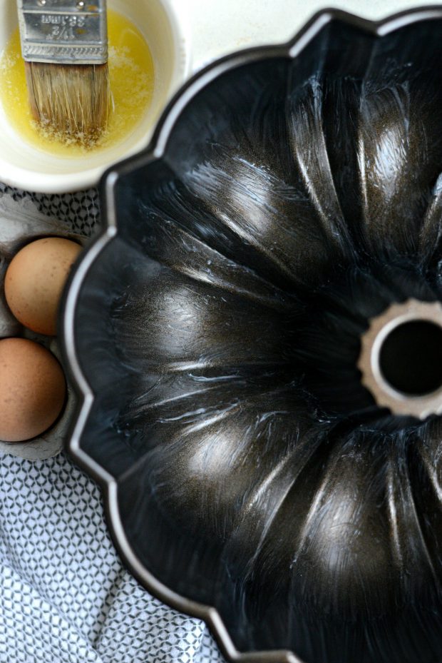 This is my go-to method when greasing a Bundt pan: I melt a tablespoon or so of butter and used my pastry brush to coat the inside of the 12-cup bundt pan generously. Avoid using to much to where it pools in the bottom, you do not want that.