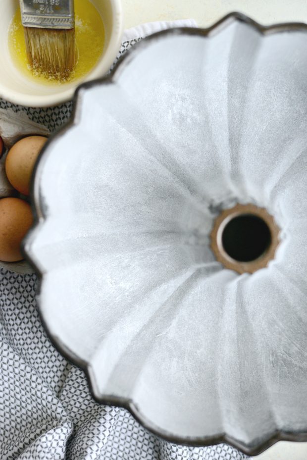 - Brush an even layer of melted butter on the inside of a 12-cup bundt pan. Add in a tablespoon of flour, turning and tapping the pan to coat. Tip any excess flour out of the pan and set aside.