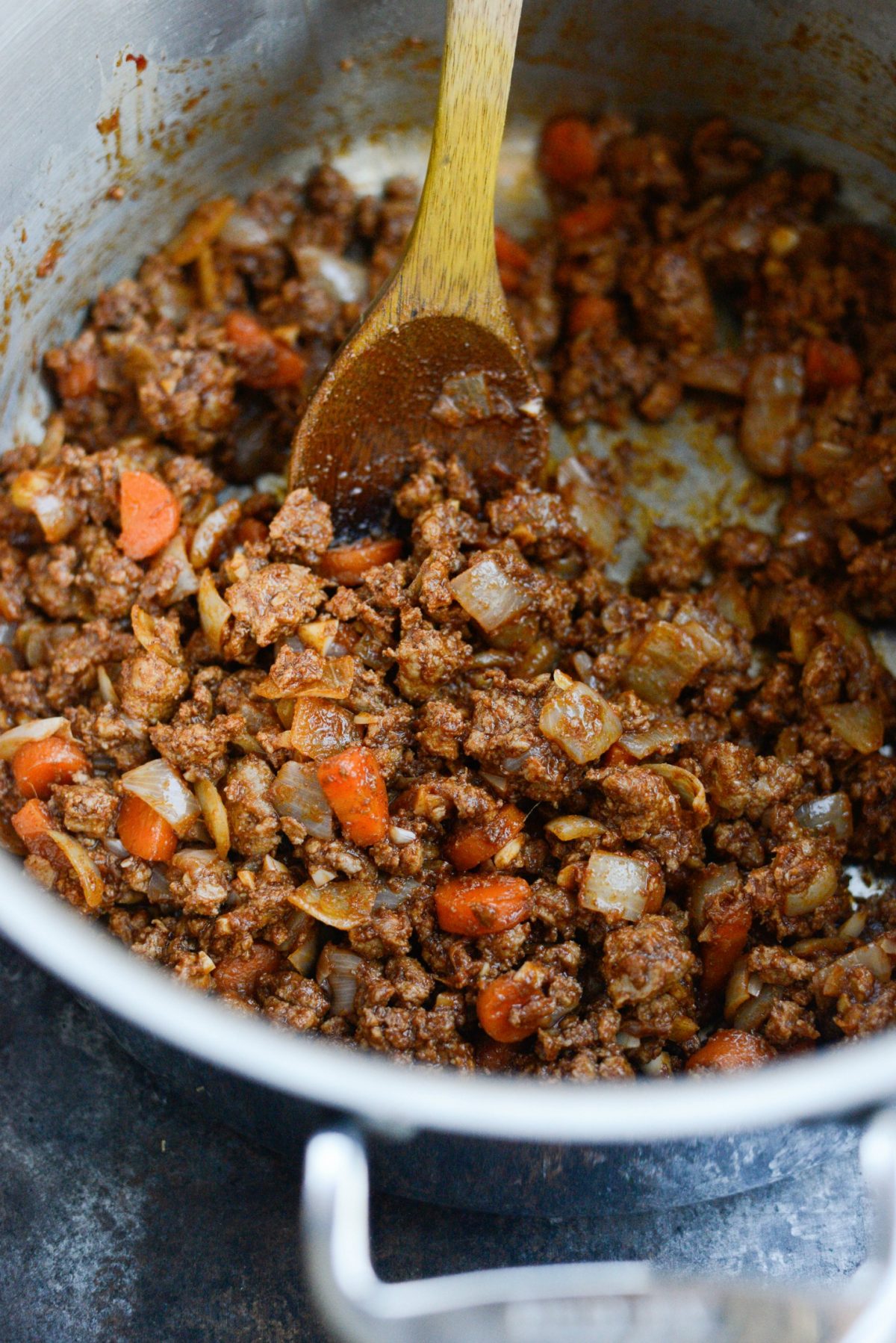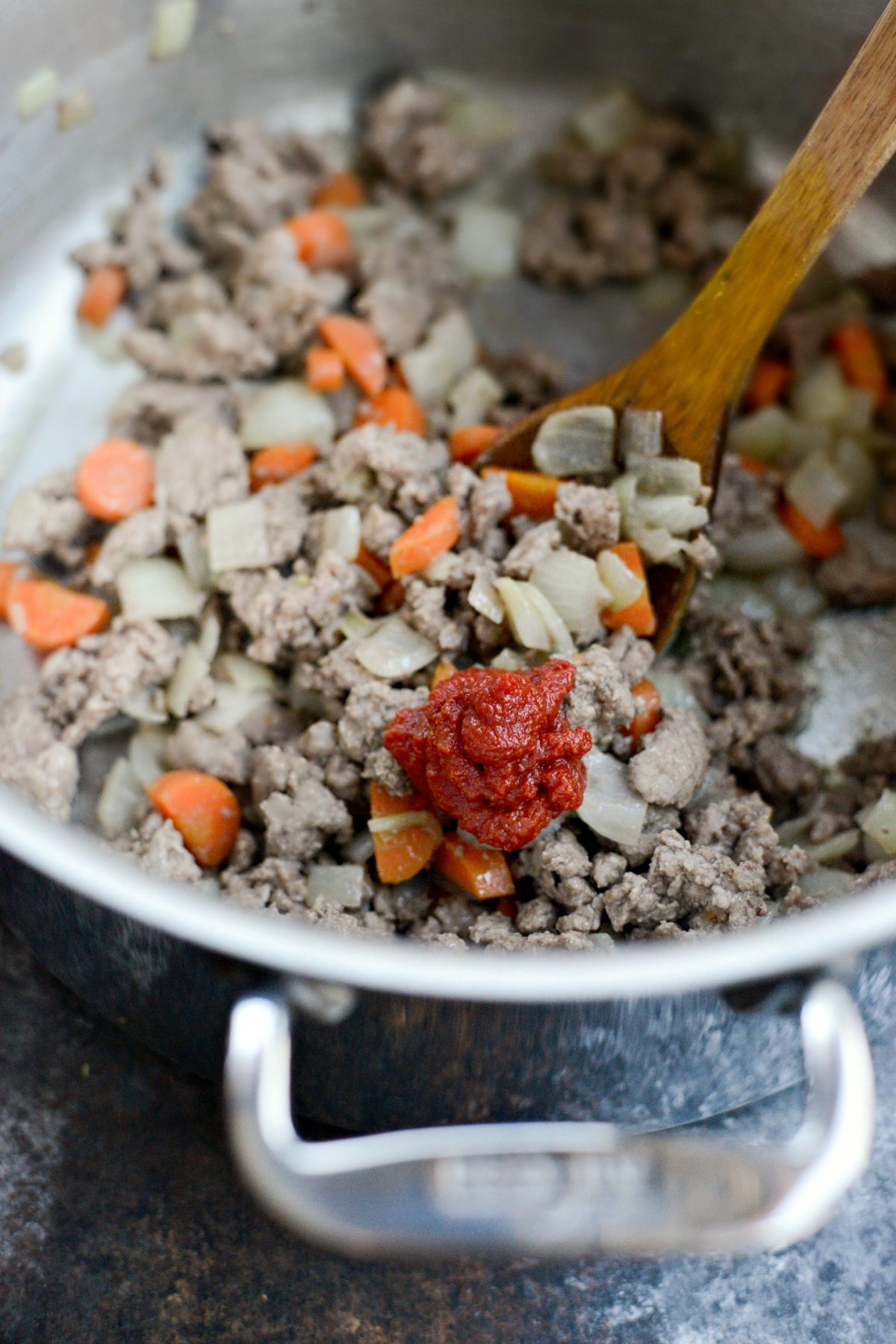 Once the lamb is fully cooked and no longer pink, add in 2 tablespoons of tomato paste. Stir and cook for 1 to 2 minutes or until the paste begins to caramelize on the bottom of the pot.