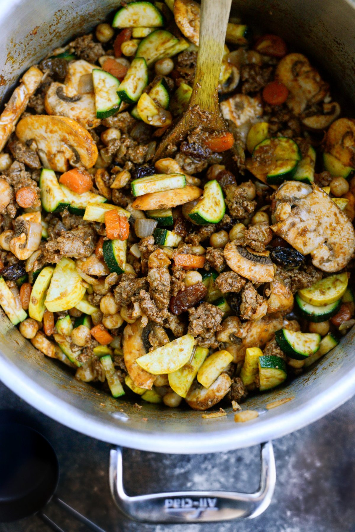 In goes the prepped zucchini, yellow squash, 8 ounces mushrooms, [1 (15 ounce) can, drained and rinsed] chickpeas and 1/2 cup of raisins. Gently toss to combine and cook for about 5 minutes to start softening them up.