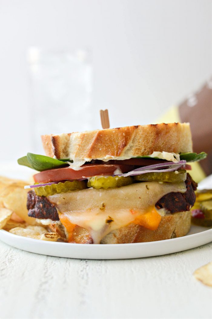 First I grill one side of sourdough bread and then top with with a super simple homemade roasted garlic aioli, then add 2 different slices of cheese before slipping it under the broiler to melt. Afterwards, add toppings like; pickles, onions, tomatoes and baby spinach (arugula would also be amazing!).