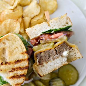 This Leftover Meatloaf Sandwich is a great way to use up dinner leftovers. Grilled sourdough bread is slathered with a simple garlic aioli, reheated homemade meatloaf, melted cheddar and pepper jack cheese topped with pickles, onions, tomatoes and spinach. This recipe yields 4 but can easily be scaled up or down.