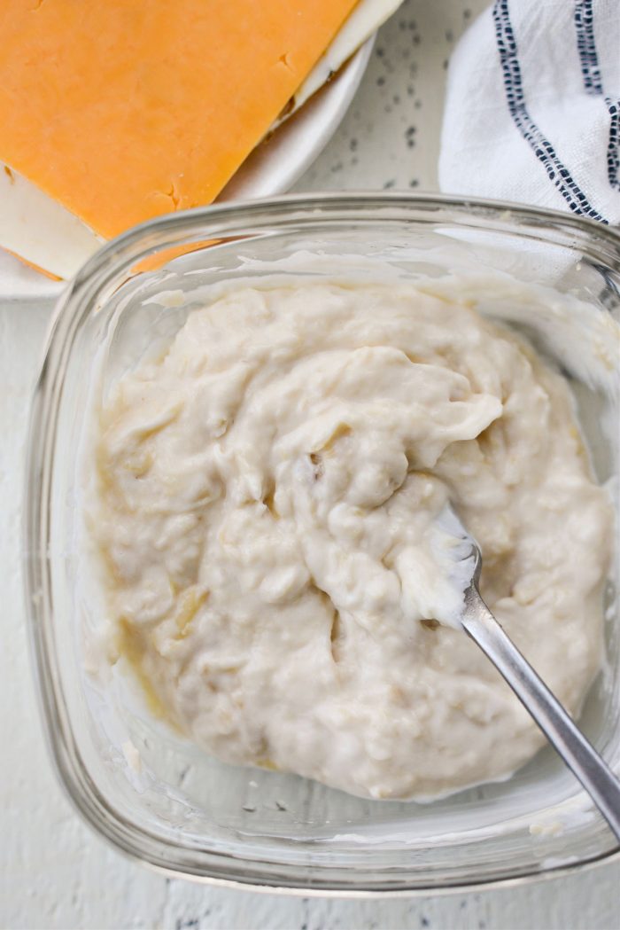 Once the garlic has roasted and is safe to handle, squeeze out the roasted cloves of garlic into a bowl. Stir in 1/2 cup mayonnaise. Use your favorite mayo here.
