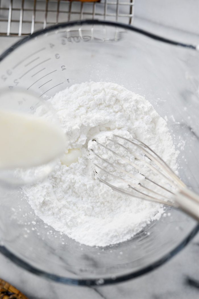 - Sift the powdered sugar into a bowl. Pour in 2 to 2½ tablespoons of buttermilk and whisk until smooth. It should be thick but a pourable consistency.