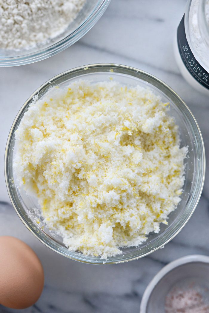 - In a separate bowl combine sugar with lemon zest. Use you fingers to work the sugar into the zest until it resembles wet sand.