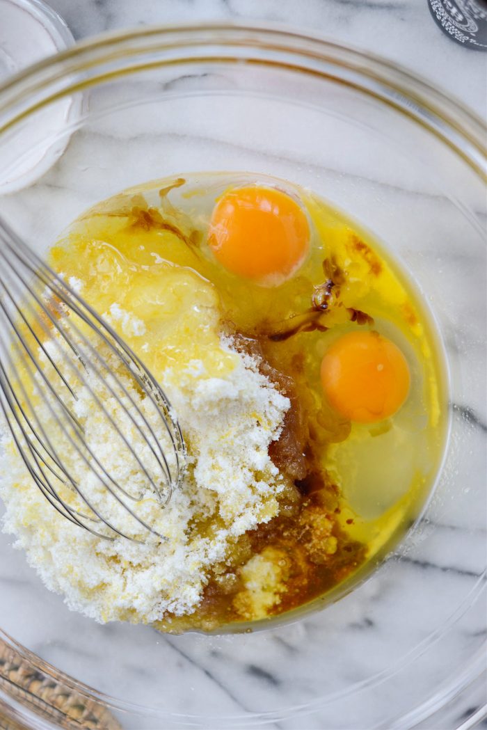 In a larger mixing bowl, add all of the lemon sugar, crack in 2 large eggs, pour in 1/3 cup of melted (and cooled) unsalted butter, 3 tablespoons fresh squeezed lemon juice (no seeds or pulp) and 1 teaspoon vanilla extract.